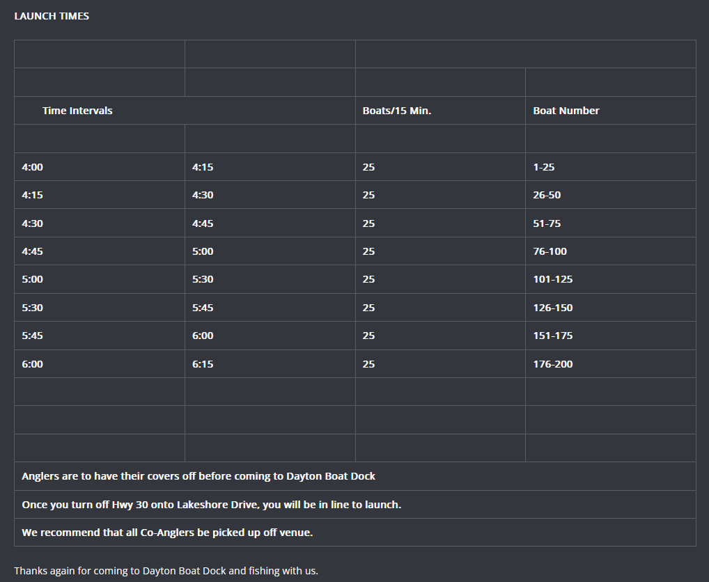 The below information is to help all Anglers get to the water as quickly and safely as possible. We are limited to space and would appreciate everyone complying with these guidelines.