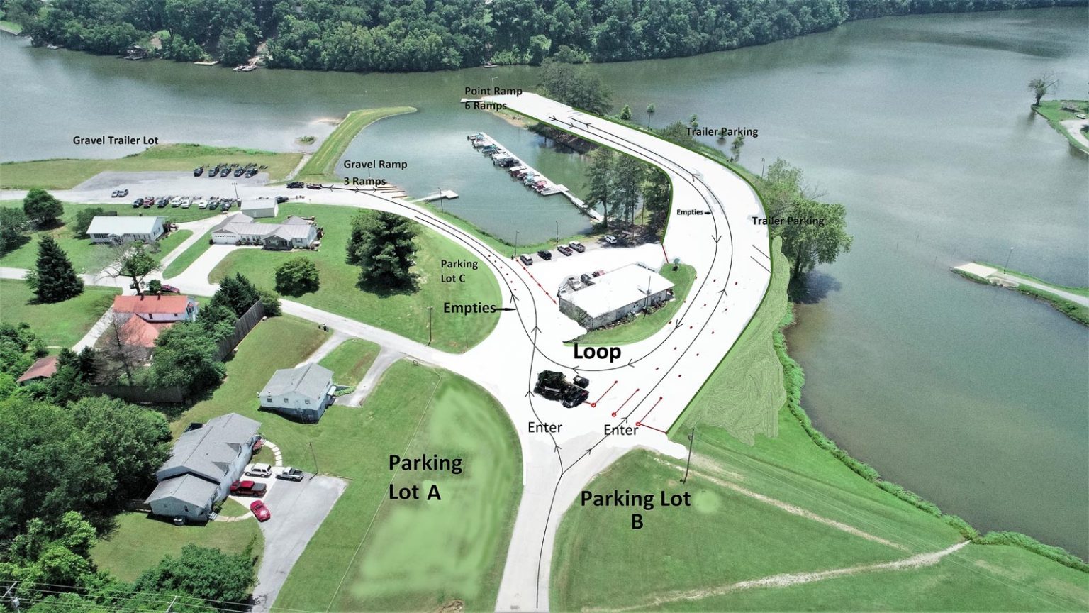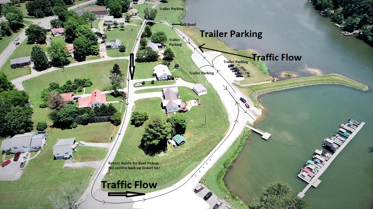 Once the Point Parking is full you can still unload on this side but be sent back toward the entrance where you came in and will use the Loop to take you to the Left Hand Lane around the Anglers that are unloading in the Right Hand Lane. This is the Gravel Parking/Ramps. You will be directed from that point around the unloading Anglers to be parked on the mountainside or the lakeside of the Gravel Lot. Please pull in as far as possible. Exit from this lot is at the far end on the left and immediately go left on Lakeshore Drive. We ask when returning to load your boat that you take this exit back to where you entered at the Big Tree and you can either use the Point Ramp or Gravel Lot Ramp. Keeping this Flow will make it easier and safer for everyone.